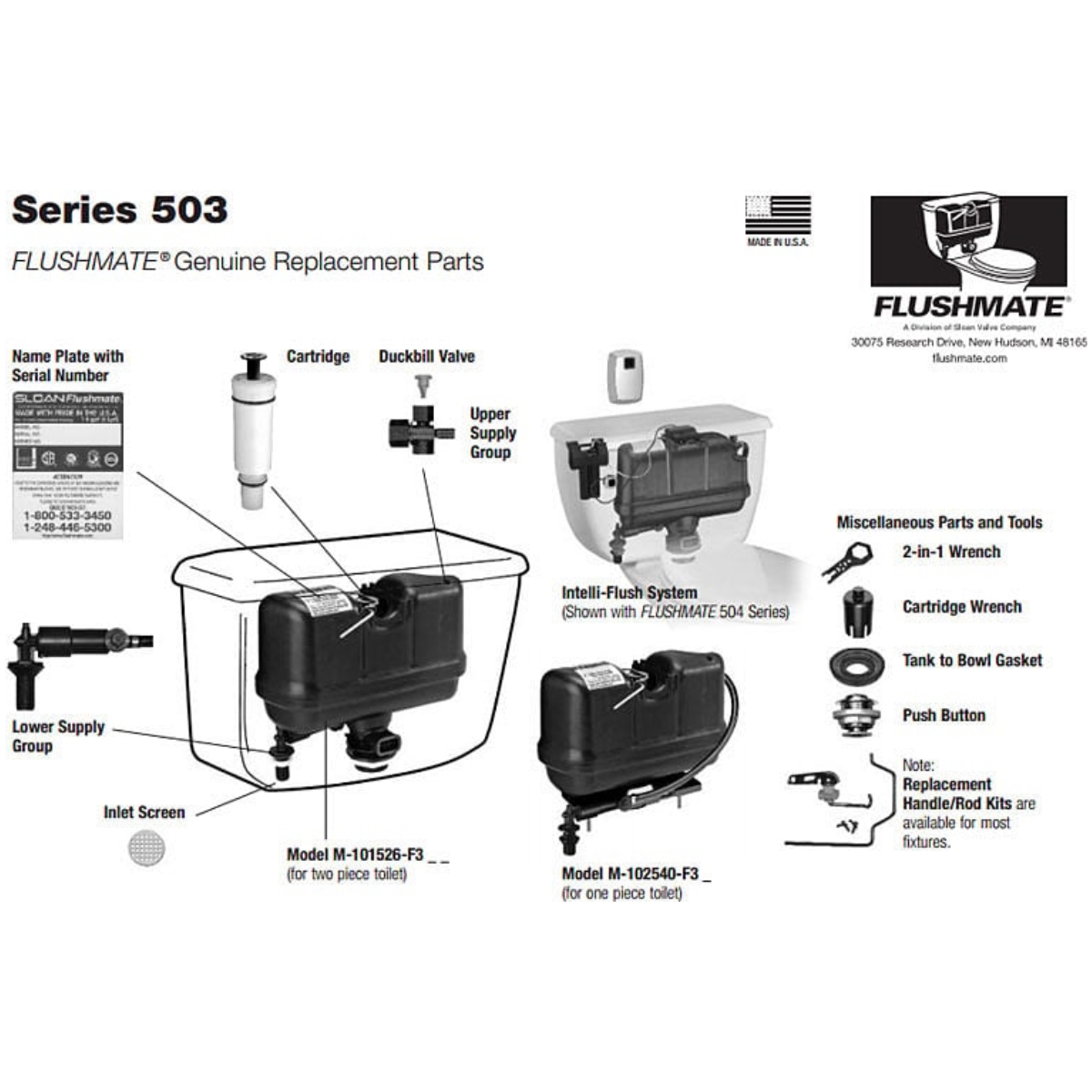 M-101526-F31The M-101526-F31 Flushmate System is a complete pressure-assist flush 1.6 gpf system for 503 series tanks. It fits all 503 series toilets EXCEPT for the Kohler 4404.