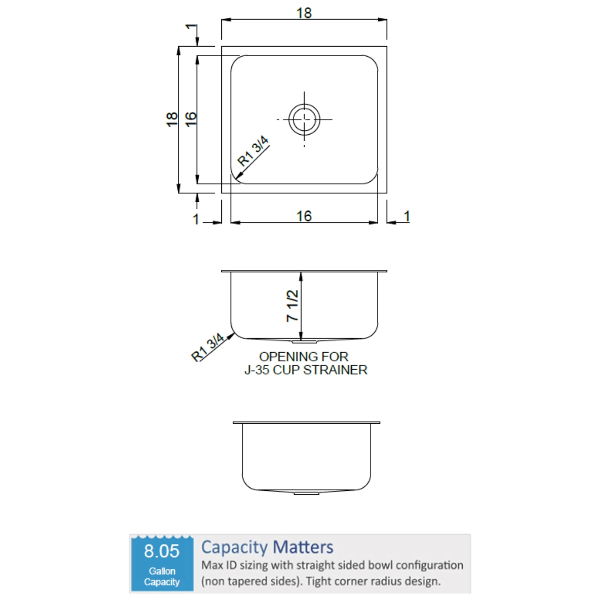 - Maximum capacity straight-sided compartment with 1 3/4" radius corners