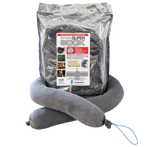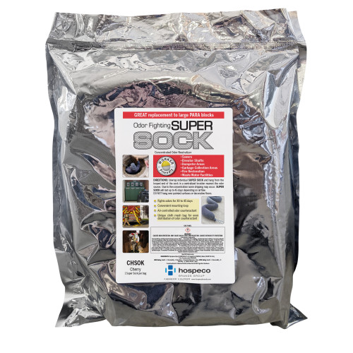This industrial strength SUPER SOCK deodorizer holds a powerful and effective concentrated odor neutralizer. Each SUPER SOCK will provide deodorization for 30 to 45 days. It is specially designed to neutralize odors in sewers, elevator shafts, dumpster areas, garbage collection areas, industrial plants, water treatment facilities or anywhere that strong undesirable odors are present.