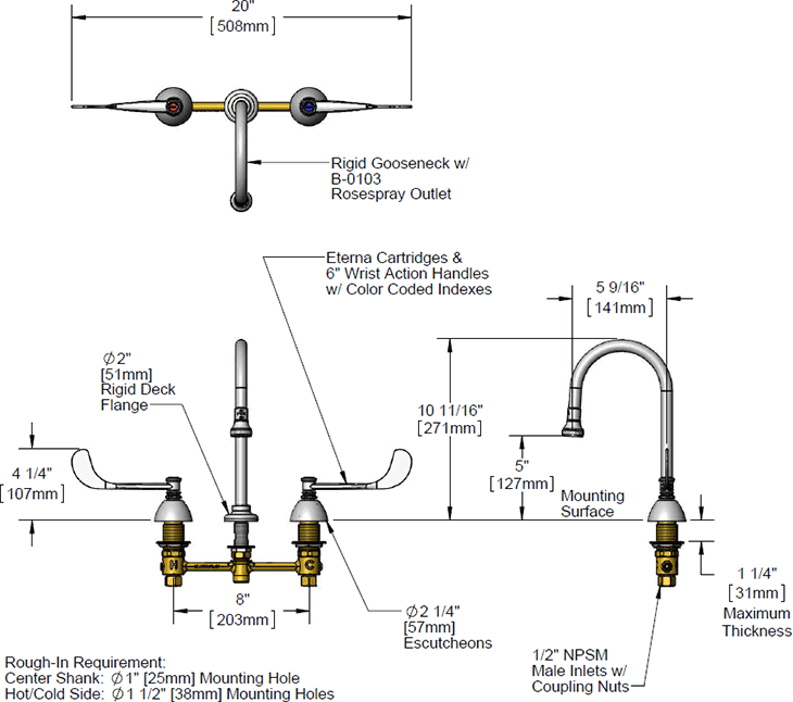 B-28658" concealed deck mount mixing faucet with forged brass body, 5-13/16" rigid/swivel gooseneck with 2.2 GPM rosespray outlet, compression cartridges with spring checks, 6" wrist action handles, chrome plated escutcheons and 1/2" NPT male inlets with coupling nuts. Certified to ASME A112.18.1/CSA B125.1, NSF 61-Section 9 and NSF 372. Meets ADA ANSI/ICC A117.1 requirements.