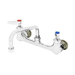 B-2414-CR-SC8" wall mount mixing faucet with polished chrome plated brass body, 8" swing nozzle with stream regulator outlet, ceramic cartridges with check valves, lever handles and 1/2" NPT female inlets. Certified to ASME A112.18.1/CSA B125.1, NSF 61-Section 9 and NSF 372. Meets ADA ANSI/ICC A117.1 requirements.