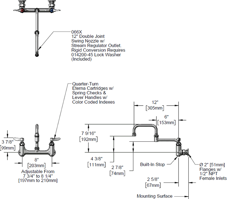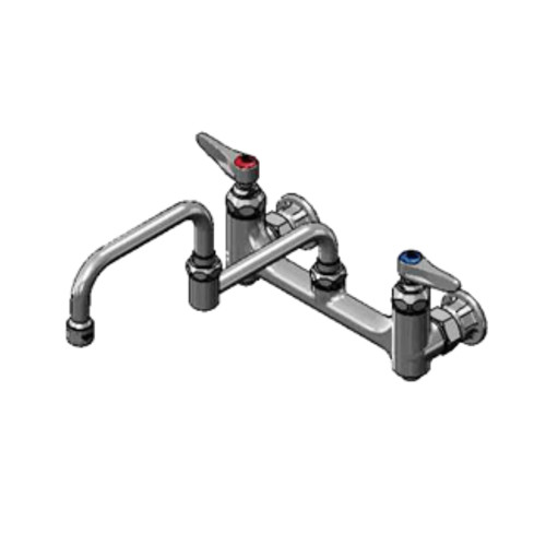 B-0267-BST8" wall mount mixing faucet with polished chrome plated brass body, built-in service stops in body, 12" double joint swing nozzle with stream regulator outlet, compression cartridges with spring checks, lever handles and 1/2" NPT female inlets. Certified to ASME A112.18.1/CSA B125.1, NSF 61-Section 9 and NSF 372. Meets ADA ANSI/ICC A117.1 requirements.