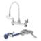 8" deck mount mixing faucet with chrome plated brass body, 8-13/16" swivel gooseneck with 2.2 GPM aerator, compression cartridges with spring checks, 4" wrist action handles, 1/2" NPT male inlets, chrome plated escutcheon, 84" flexible stainless steel hose with heat resistant handle, high flow spray valve (blue) and hose guide. Certified to ASME A112.18.1/CSA B125.1, NSF 61-Section 9 and NSF 372.