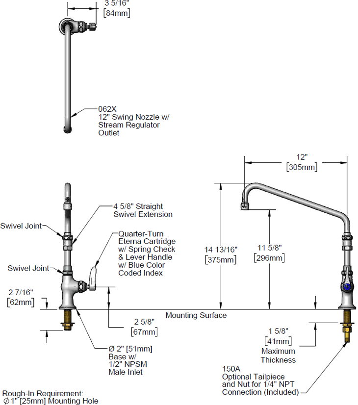 B-0206-01Single hole single temperature deck mount faucet with polished chrome plated brass body, 12" swing nozzle with stream regulator outlet, 4 5/8" extension, compression cartridge with spring check, lever handle, and 1/2" NPSM male inlet. Certified to ASME A112.18.1/CSA B125.1, NSF 61-Section 9 and NSF 372. Meets ADA ANSI/ICC A117.1 requirements.