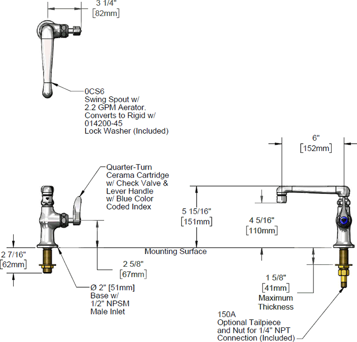 B-0208-CRSingle hole single temperature deck mount faucet with polished chrome plated brass body, 6" cast spout with 2.2 GPM aerator, ceramic cartridge with check valve, lever handle, and 1/2" NPSM male inlet. Certified to ASME A112.18.1/CSA B125.1, NSF 61-Section 9 and NSF 372. Meets ADA ANSI/ICC A117.1 requirements.