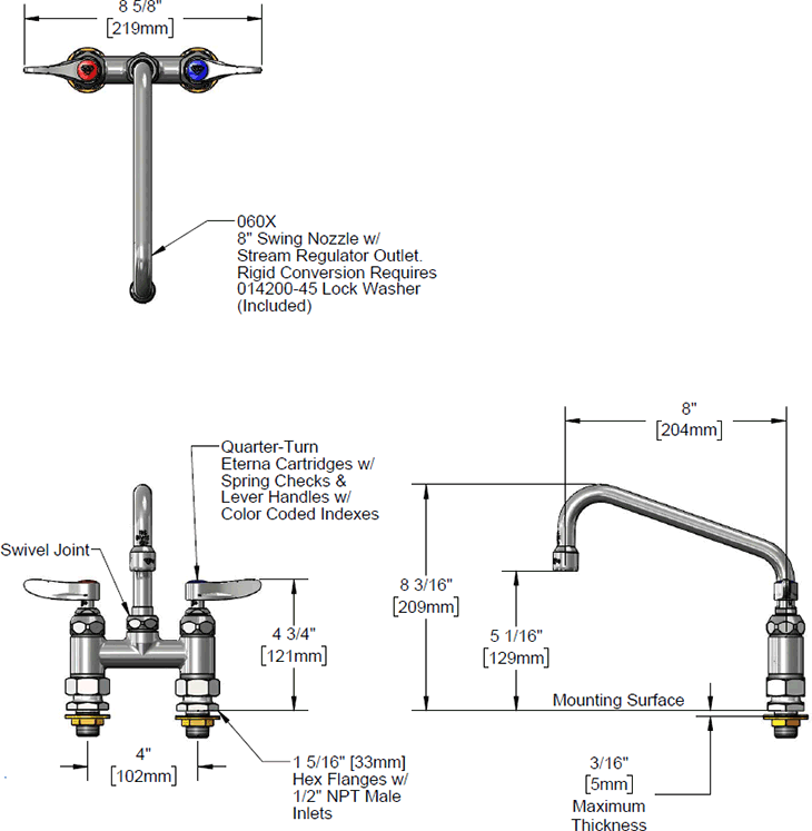 B-0227-CC4" deck mount mixing faucet with polished chrome plated brass body, 8" swing nozzle with stream regulator outlet, compression cartridges with spring checks, lever handles and 1/2" NPT male inlets. Certified to ASME A112.18.1/CSA B125.1, NSF 61-Section 9 and NSF 372. Meets ADA ANSI/ICC A117.1 requirements.