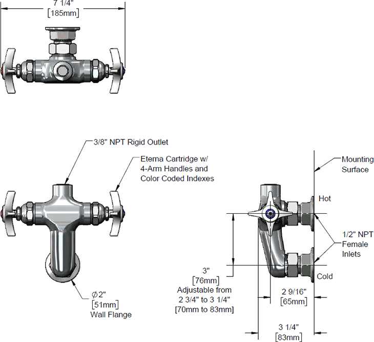 B-0315-LNWall mount vertical mixing faucet with polished chrome plated brass body, 3/8" NPT rigid outlet (less nozzle), compression cartridges, 4-arm handles and 1/2" NPT female inlets. Certified to ASME A112.18.1/CSA B125.1, NSF 61-Section 9 and NSF 372. Meets ADA ANSI/ICC A117.1 requirements.