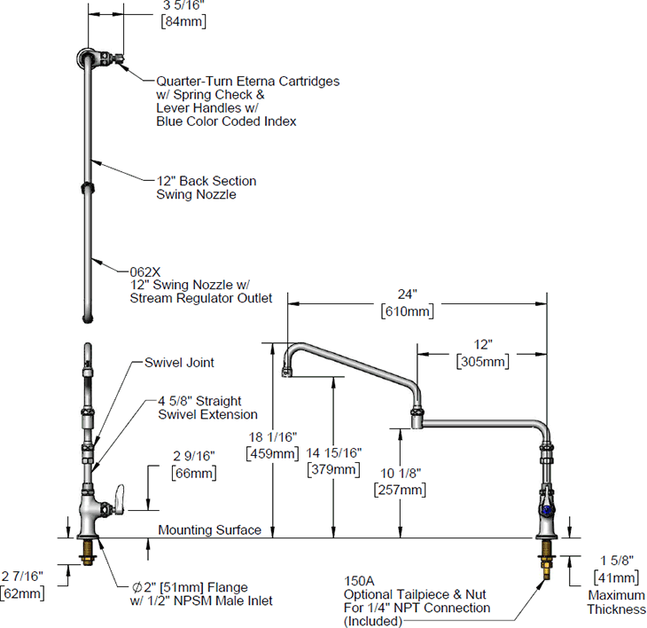 B-0319-03Single hole single temperature deck mount faucet with polished chrome plated brass body, 24" double joint swing nozzle with stream regulator outlet and swivel body, 4-5/8" straight swivel extension, compression cartridge with spring check, lever handle and 1/2" NPSM male inlet. Certified to ASME A112.18.1/CSA B125.1, NSF 61-Section 9 and NSF 372. Meets ADA ANSI/ICC A117.1 requirements.