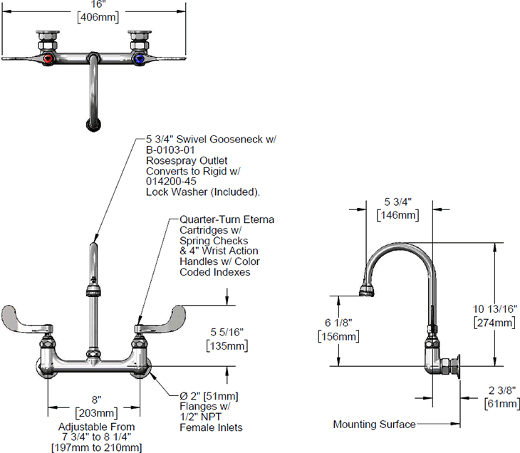 B-0350-048" wall mount mixing faucet with polished chrome plated brass body, 5-13/16" swivel/rigid gooseneck with 2.2 GPM rosespray outlet, compression cartridges with spring checks, 4" wrist action handles and 1/2" NPT female inlets. Certified to ASME A112.18.1/CSA B125.1, NSF 61-Section 9 and NSF 372. Meets ADA ANSI/ICC A117.1 requirements.