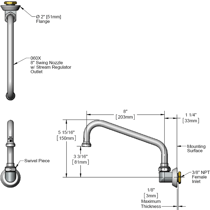 B-0526-3Wall mount dummy 8" swing nozzle with polished chrome plated brass elbow and gooseneck, stream regulator outlet, 3/8" NPT female inlet and adjustable wall flange. Certified to ASME A112.18.1/CSA B125.1, NSF 61-Section 9 and NSF 372.