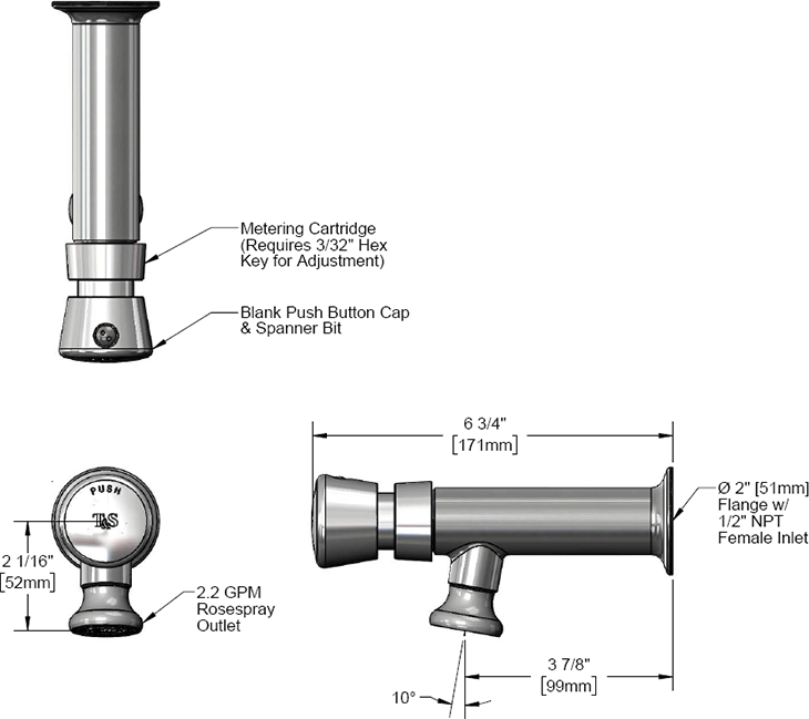 B-0800Single hole, single temperature wall mount faucet with polished chrome plated brass body, 2.2 GPM rosespray outlet, metering cartridge, blank push button cap and 1/2" NPT female inlet. Certified to ASME A112.18.1/CSA B125.1, NSF 61-Section 9 and NSF 372. Meets ADA ANSI/ICC A117.1 requirements.