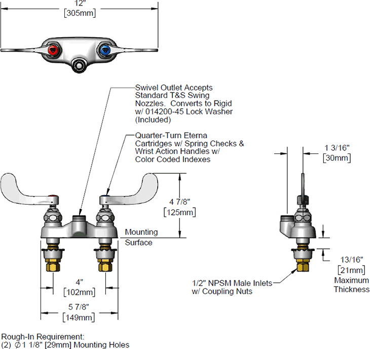 B-0892-LN4" centerset deck mount mixing faucet with polish chrome plated brass body, less gooseneck, compression cartridges with spring checks, 4" wrist action handles and 1/2" NPSM male inlets. Certified to ASME A112.18.1/CSA B125.1, NSF 61-Section 9 and NSF 372. Meets ADA ANSI/ICC A117.1 requirements.