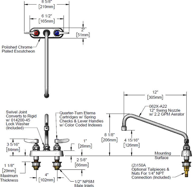 B-1113-XS4" deck mount mixing faucet with chrome plated brass body, 12" swing nozzle with 2.2 GPM aerator, compression cartridges with spring checks, lever handles, 1/2" NPSM extended male inlets and chrome plated escutcheon. Certified to ASME A112.18.1/CSA B125.1, NSF 61-Section 9 and NSF 372. Meets ADA ANSI/ICC A117.1 requirements.