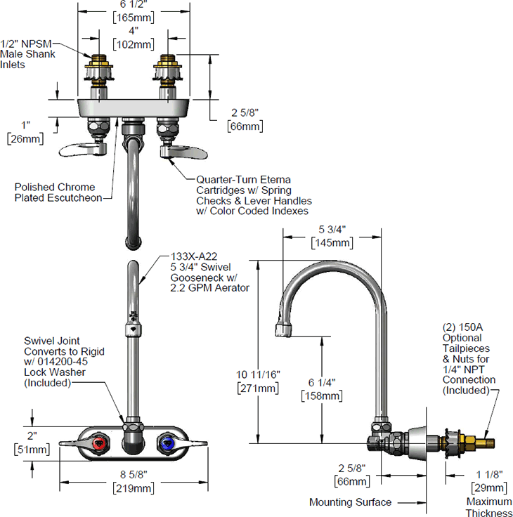 B-1146-XS4" wall mount mixing faucet with chrome plated brass body, 5 3/4" swivel gooseneck with 2.2 GPM aerator, compression cartridges with spring checks, lever handles, 1/2" NPSM male extended shanks and chrome plated escutcheon. Certified to ASME A112.18.1/CSA B125.1, NSF 61-Section 9 and NSF 372. Meets ADA ANSI/ICC A117.1 requirements.