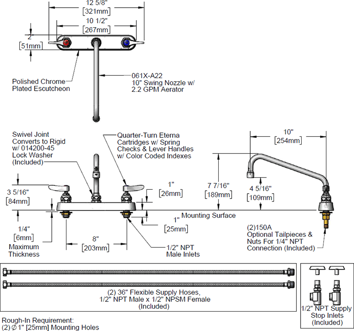 B-11648" deck mount mixing faucet with chrome plated brass body, 10" swing nozzle with 2.2 GPM aerator, compression cartridges with spring checks, lever handles, (2) 36" flexible supply hoses, 1/2" NPT supply stop female inlets and chrome plated escutcheon. Certified to ASME A112.18.1/CSA B125.1, NSF 61-Section 9 and NSF 372. Meets ADA ANSI/ICC A117.1 requirements.