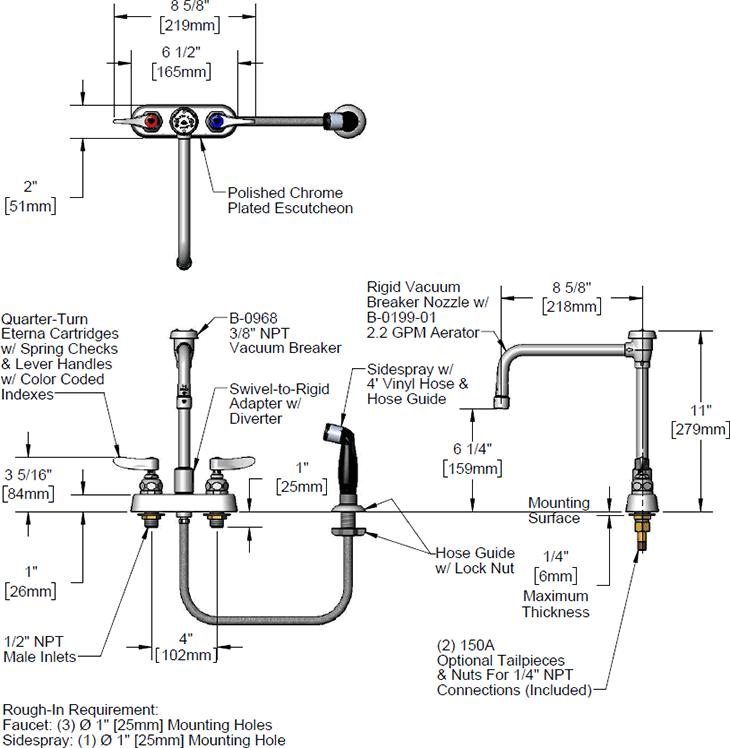 B-11774" deck mount mixing faucet with chrome plated brass body, rigid spout with vacuum breaker and 2.2 GPM aerator, swivel to rigid adapter with diverter, compression cartridges with spring checks, lever handles, 1/2" NPT male inlets, polished chrome plated escutcheon, sidespray with 4 ft. vinyl hose and hose guide. Certified to ASME A112.18.1/CSA B125.1, NSF 61-Section 9, NSF 372 and ASSE 1001. Meets ADA ANSI/ICC A117.1 requirements.