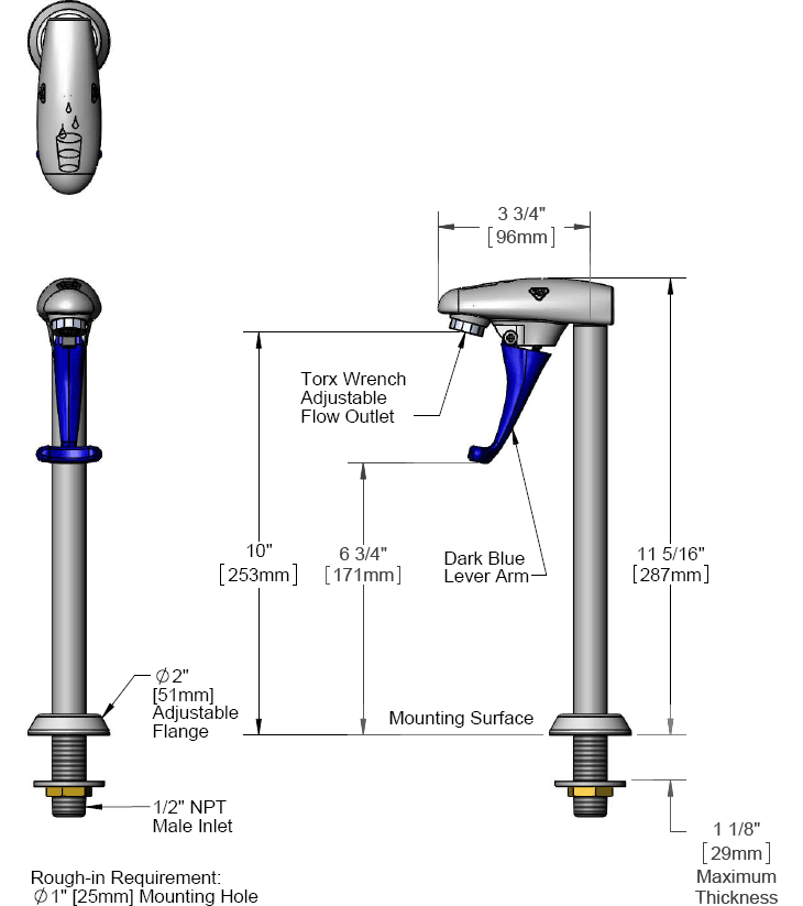 B-1210-0110" high deck mount glass filler with polished chrome plated brass body, adjustable flow outlet, push back actuation arm, pedestal with adjustable deck flange and 1/2" NPT male inlet. Certified to ASME A112.18.1/CSA B125.1, NSF 61-Section 9 and NSF 372. Meets ADA ANSI/ICC A117.1 requirements.