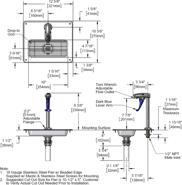 B-1230Deck mount water station with polished chrome plated brass pedestal type glass filler, adjustable flow outlet, push back actuation arm, pedestal with adjustable deck flange, 18 gauge stainless steel drip pan with drop-in grid and 1-1/4" drain. Certified to ASME A112.18.1/CSA B125.1, NSF 61-Section 9 and NSF 372. Meets ADA ANSI/ICC A117.1 requirements.