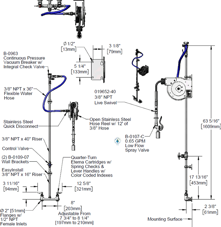 B-1433-7102-01C8" wall mount mixing faucet with polished chrome plated brass body, compression cartridges with spring checks, lever handles, 1/2" NPT female inlets, 16" riser, control valve, 40" riser, wall brackets, continuous pressure vacuum breaker, 36" flexible water hose connector with stainless steel quick disconnect, open stainless steel hose reel with 3/8" x 12' heavy-duty non-marking hose, ratcheting system, 0.65 GPM low flow spray valve with swivel, multi-fit bracket and adjustable hose bumper. Certified to ASSE 1056.