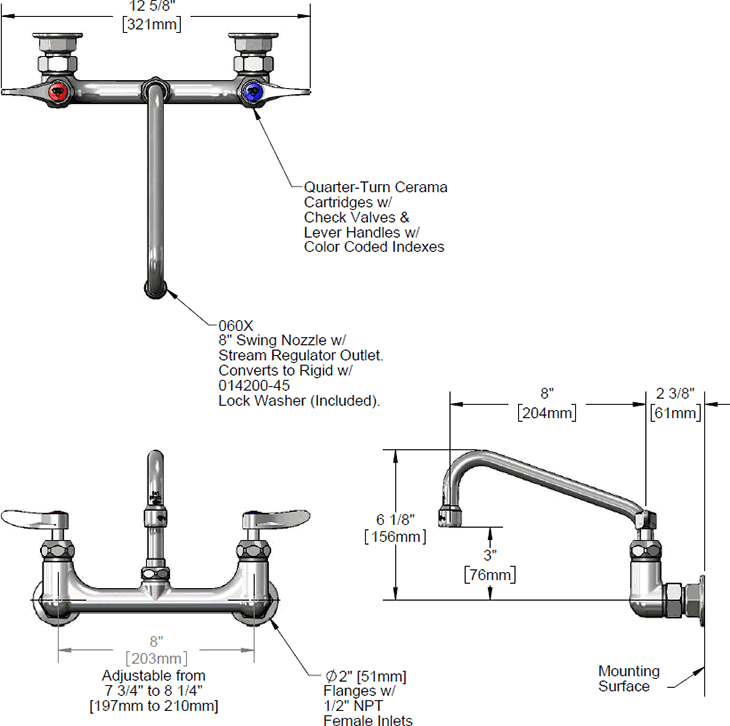 8 Wall Mount Mixing Faucet w/ CV Ceramas, 8 Swing Nozzle (