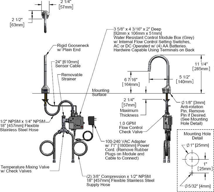 EC-3100-XP-LF10Single hole deck mount electronic sensor faucet with polished chrome plated brass body, rigid gooseneck with plain end, 1.0 GPM flow regulating check valve, AC/DC control module with internal flow control setting switches, temperature control mixing valve with check valves and 18" flexible stainless steel supply hoses with 3/8" compression connections. Certified to ASME A112.18.1/CSA B125.1, NSF 61-Section 9, NSF 372 and UL 1951. Meets ADA ANSI/ICC A117.1 requirements.