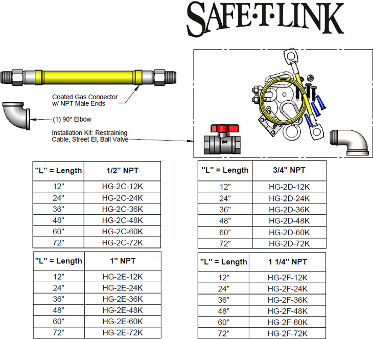 48" coated gas appliance connector hose with 3/4" NPT male connections and installation kit. Certified to ANSI Z21.69 / CSA 6.16 and NSF 2.