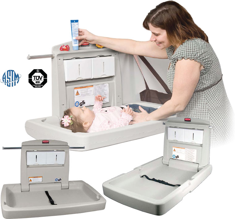 Horizontal and vertical wall-mounted changing station products meet all global safety standards (ASTM, ADA, and EN).